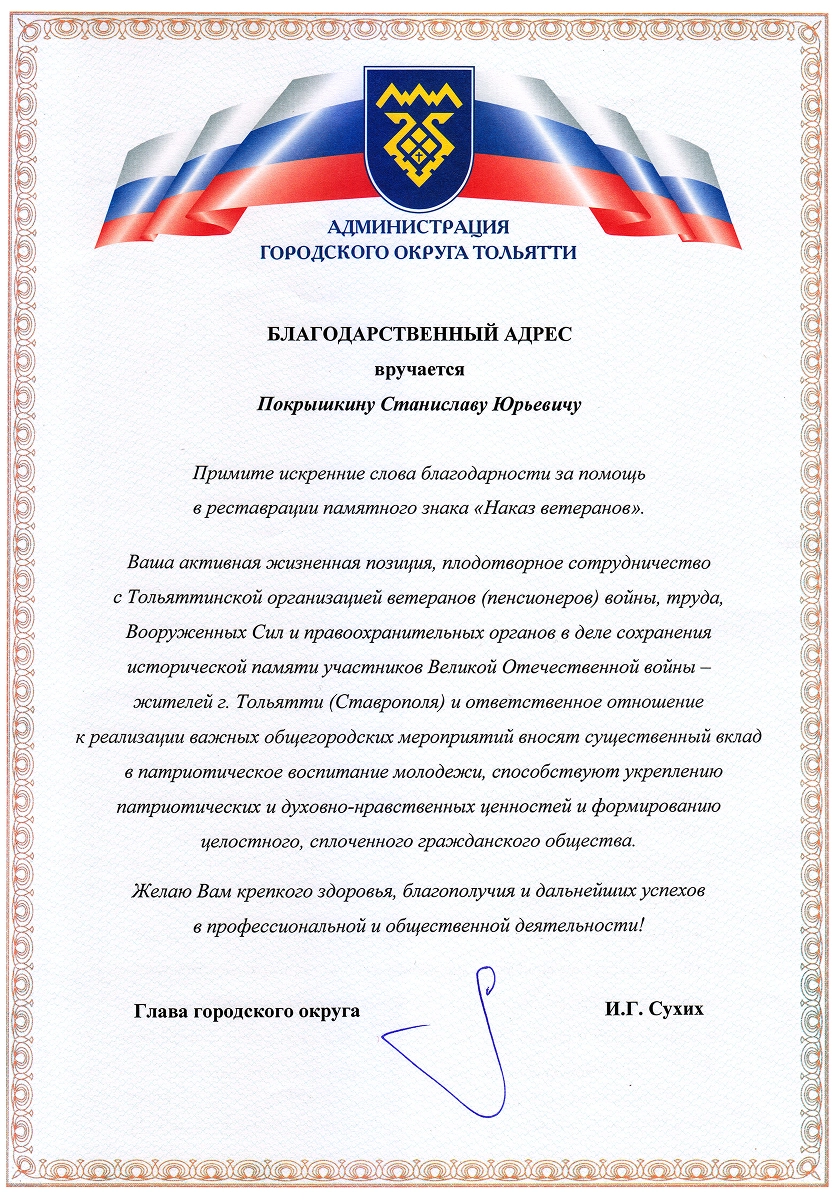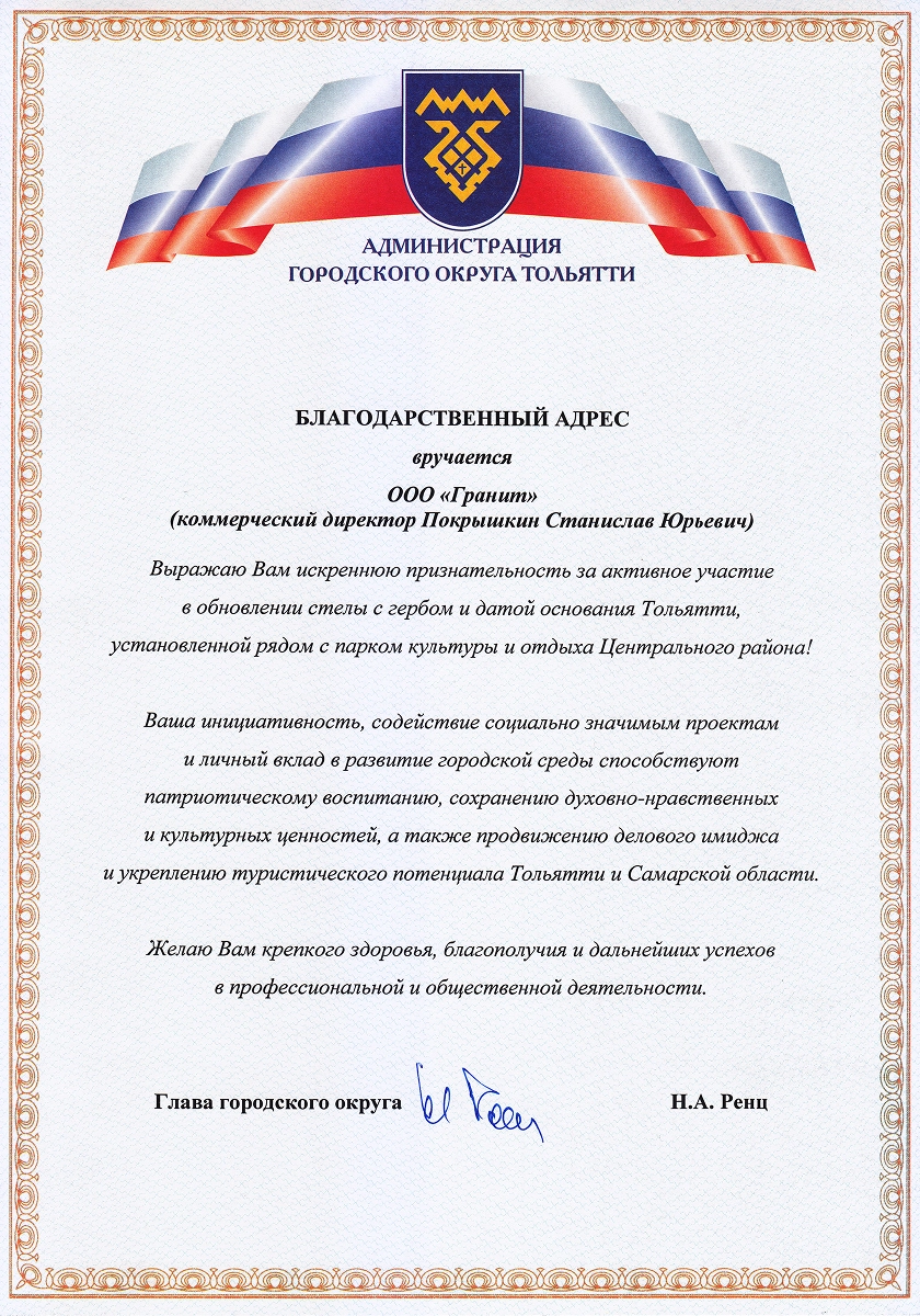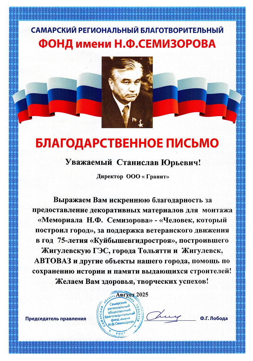 Изготовили и установили на бульваре Космонавтов в Тольятти гранитный памятник «И помнит мир спасённый». Стела служит символом памяти и благодарности, напоминая о важности героизма и самопожертвования в сложных и трагических обстоятельствах.