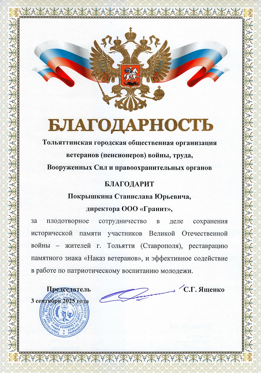 Компания была основана в 1998 году Юрием Григорьевичем Покрышкиным и изначально имела другое название. Свое нынешнее имя — «Гранит Памяти» — она получила в 2019 году, когда руководство принял его сын, Станислав Юрьевич. Вместе с командой он провёл ребрендинг и вывел компанию на новый уровень развития. Более 25 лет мы производим в Тольятти памятники из натурального гранита и мрамора — камня, который сохраняет память поколений. За это время компания значительно выросла: открыты новые филиалы и запущена франшиза, позволяющая распространять наш опыт в других регионах. Сегодня «Гранит Памяти» — узнаваемый бренд с широкой сетью партнёров.